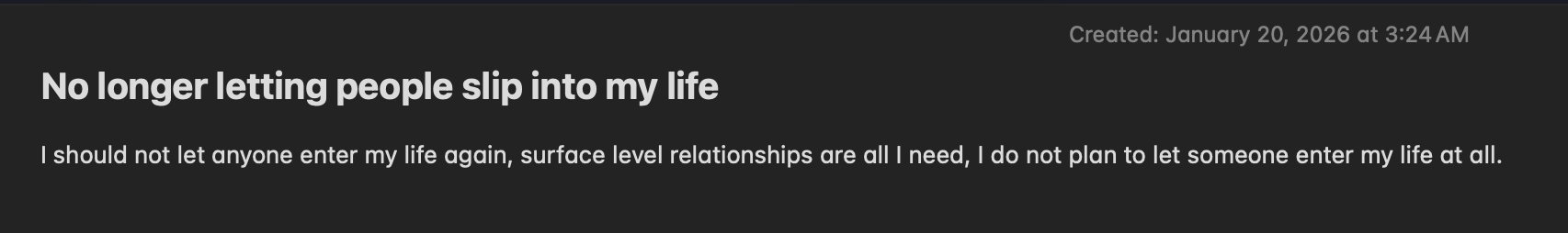 I wrote that note to myself at some point and couldn’t argue with it when I found it again. it said what I hadn’t been able to know for three years. that the intention to stay sealed, to not know and not be known, isn’t being challenged by anything inside me. not a single thought pushes back against it. and that is what frightens me. not the isolation, I’m fine with ti. but the silence where the resistance should be. I don’t see a world where I want to know anyone. I don’t see a world where I want to be known. and what scares me most is that it doesn’t feel like a problem. it feels like a conclusion. I’m fine with it. And I don’t know what to do with that.