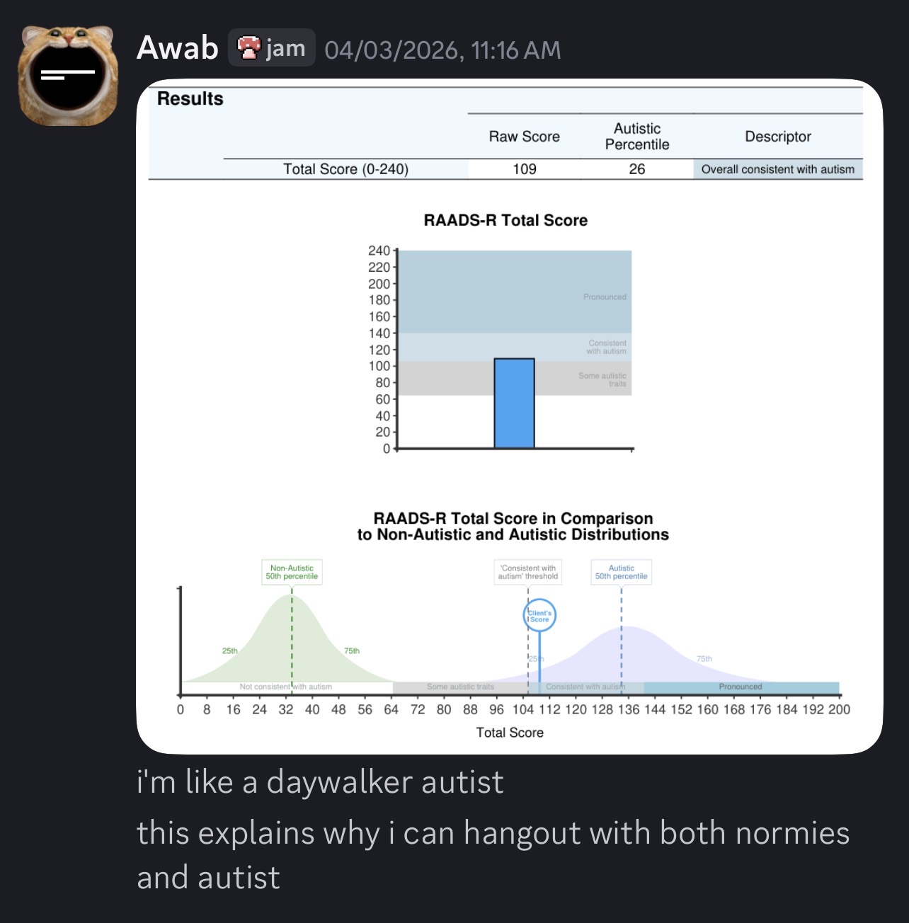Recently, my friend Awab took an autism spectrum test. He landed right in the middle, not fully neurotypical, which we refer to as normies, not clinically autistic, just somewhere in between. And when the results came back, they explained his entire life: why he found it hard to get along with normies, and also why people on the more severe end of the spectrum felt foreign to him too. Both groups were extremes. Awab was neither. So he’d spent his life as this unusual in between, never fully belonging to either side.